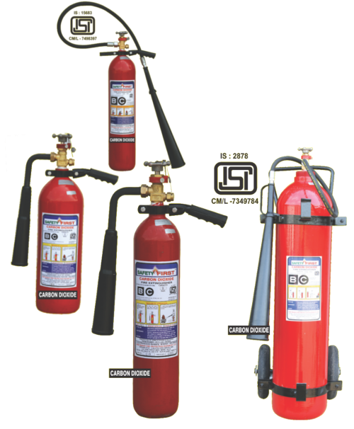 ISI mark carbon dioxide type fire extinguisher are suitable for 'B' & 'C' class fires involving all flammable liquids, gases, live & delicate, machinery fires, electrical & sophisticated electronic equipment fires, transformer & switch gear fire. This extinguisher is approved by explosive department, Govt. of India, Nagpur. The new CO2 squeeze grip type portable fire extinguisher from safety fire is also available.