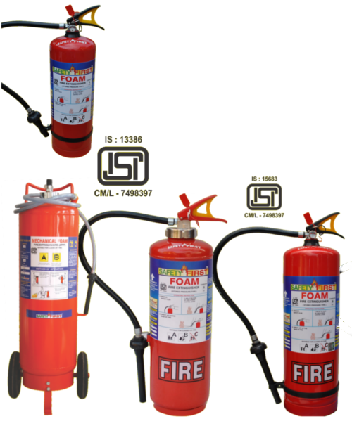 ISI mark foam type fire extinguisher is designed to extinguish 'A' & 'B' class of fire involving wood, paper, cloth, textile, stationery, flammable and volatile liquids like oil, petrol, kerosene, solvent, chemicals, wax, resins, etc.,
